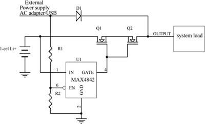 另外,MAX4842的过压?;っ畔尬?.4V-5.0V,也高于单节锂电的4.2V上限电压。电源切换电路是利用MAX4842的使能控制引脚/EN配合分压电阻R1/R2实现的。当没有外部电源接入时,如果电池电压高于2.8V-3.2V的?;っ畔?,/EN被R2拉低,MAX4842驱动Q1、Q2的栅极为高电平使其导通,电池为负载供电;当有外部电源接入时,通过R1/R2分压后在/EN引脚上产生的电压高于1.47V后MAX4842被禁止,Q1、Q2被关闭,由外部电源给负载供电。图中的二极管D2用于阻断灌入外部电源的反向电流,并防止/EN被错误拉高。由于它串在外部供电通路上,损失一点效率没有关系。