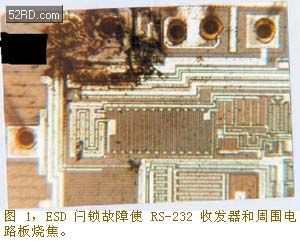 图1示出了最近对一种频繁失效的CMOS数据收发器IC进行的ESD闩锁效应调查的结果:在某些情况下,IC封装带电,并烧毁了下面的电路板。为了确定故障的原因,用一台记录仪器监视电源和RS-232收发器的输入端。记录的波形显示出在收发器器件的输入端和电源脚有短时的电压瞬变。当这些瞬变电压迫使寄生PNPN结构导通时,就发生闩锁效应。一旦寄生的SCR导通,SCR就是电源通过器件到地的一条低阻通路。在这样的条件下,通路中的电流很大,从而导致器件中因热过载而热耗散异常。过度的热过载会使塑封外壳升温并开裂。