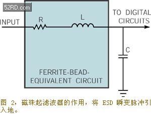 [page]一种可在电路输入级使用的简单的ESD瞬变抑制技术,就是将一个磁珠串在输入引线上,并在输入引线和地之间接一只容量很小的电容器。图2示出了磁珠的等效电路。输入端的LC电路起滤波器的作用,将ESD瞬变的能量分流入地。当使用瞬变抑制二极管?;と魏问淙攵嘶蚴涑龆耸?,要使瞬变抑制器尽量靠近这些端子。很长的导线和电路板印制线都有寄生电感,当ESD瞬变脉冲进入电路时,寄生电感就会产生电压过冲与振铃问题。