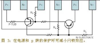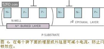 你可使用CMOS布局技术来防止闩锁效应,因为CMOS布局技术可监控ESD瞬变会进入器件的各部位:器件的电源引脚、输入引脚和输出引脚。你应降低晶体管(PNP和NPN)的增益,并提高闩锁效应的阈值,方法是加大器件结构中P沟道Tub与P沟道漏极之间的间隔。在电源和p-tub上连接p+和n+?;せ芬部梢越档途骞茉鲆?,提高闩锁效应的阈值(图3)。防止闩锁效应的其他工艺技术有:提高阱深度以减少寄生晶体管的增益;采用绝缘衬底(如蓝宝石硅)以降低tub和衬底中的电流,;在每个阱下面采用埋层或外延层(图4)。