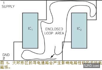 你如果使用布局和布线都很好的电路板,就可以显著减少ESD问题的发生率(见附文《实现ESD故障最小化的电路设计原则》)。每一电路都因为有不同类型的元器件和电流而存在有静电通量线和磁通量线。如果电路板布线围住很大的环形区,则导电通路就会围住较大的磁通量,由于环路起天线的作用,较大的磁通量又会在环路中感应产生电流。这种环路电流会产生影响电路中元器件的干扰电磁场。减小环路区的方法是使电源线和地线尽量靠近在一起。图5示出了典型的电源线和地线形成的环路区。