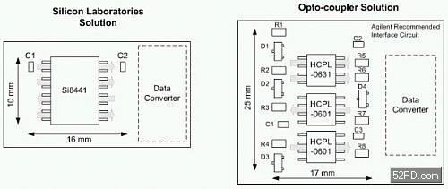 射频耦合器的暂态耐受性超过30kV/μs,光耦合器只有10kv/μs。它们还提供2500VRMS的电气隔离能力。射频耦合器的制程参数比较不容易受到制程效应影响,故对温度变动的抵抗能力也优于光耦合器,许多射频耦合器的操作温度最高都能达到125℃。相较于光耦合器,射频耦合器的最大优点在于体积更精巧。它们通常使用每个通道仅需很小晶粒面积的方式制造,许多产品甚至还採用SOIC封装技术,这使得每个封装都能提供多个通道。射频耦合器的缺点是操作范围相当有限,这使它们在高电压产品的应用受到极大限制。射频耦合器通常只能使用5V电压操作。图5显示数字隔离元件对于电路板面积的影响。