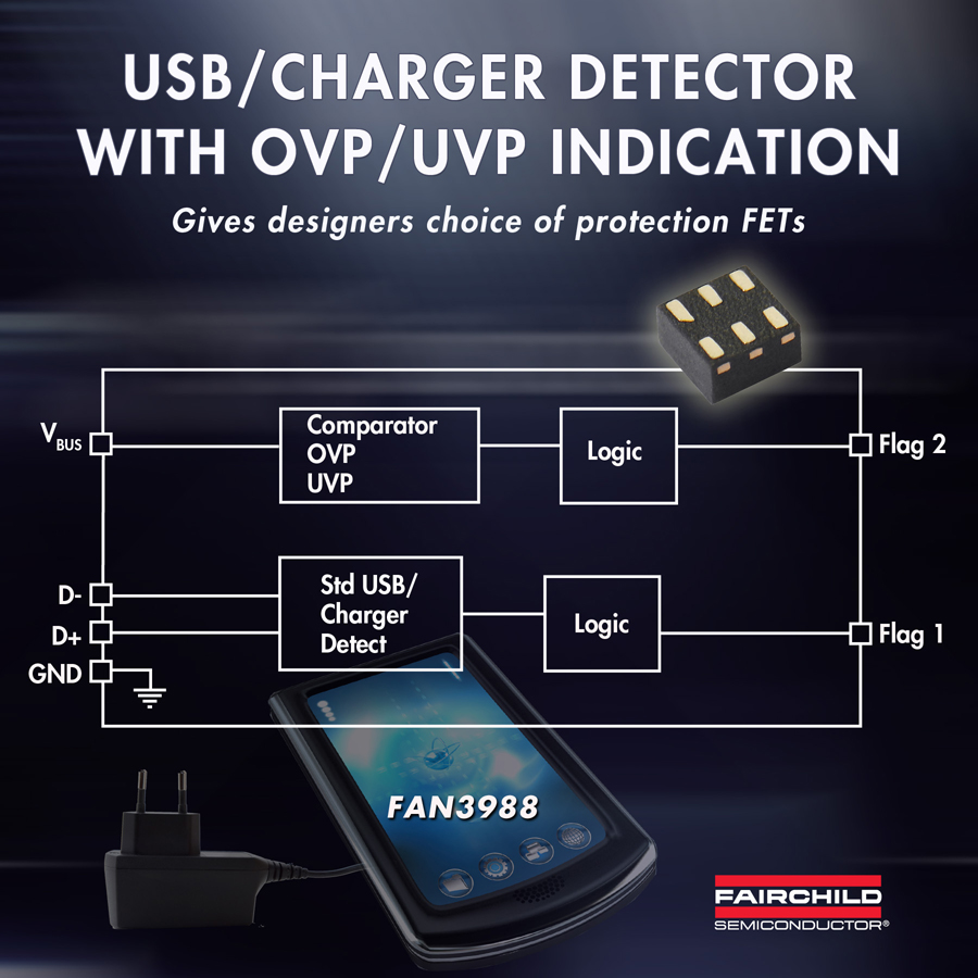 飞兆半导体公司(Farichild Semiconductor) 为手机和手持移动产品设计人员提供一款带有高集成度过电压?;?OVP)和USB/充电器检测功能的器件FAN3988。该器件是飞兆半导体OVP产品系列的最新成员,可让终端用户按照应用所需之特定导通电阻和电流能力,灵活选择外部P沟道MOSFET。