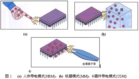器件的静电破坏模式大致分为以下3种:人体带电模式(HBM)、机器模式(MM)、器件带电模式(CDM)。