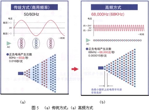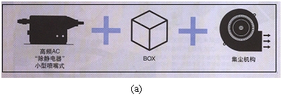 如Creceed除静电盒产品具有3种功能:除静电、除尘与集尘。其构成由小型喷嘴式高频AC“除静电器”与BOX及集尘机构组成,如图3(a)所示。