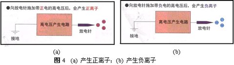 ⑵ 电晕放电是指:2个导体之间产生局部高电压时,因空气绝缘遭到破坏而产生的伴有蓝紫色辉光的放电现象。电晕放电式除静电器会对放电针施加高电压,从而引起电晕放电。由于电晕放电的缘故,放电针附近的空气发生电离,产生带电离子。图4(a)所示为向放电针施加带正电的高电压后产生正离子过程。图4(b)所示为向放电针施加带负电的高电压后,产生负离子过程。