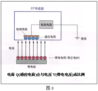 静电电位传感器“EP传感器”主要利用了带电物体和检测电极之间的静电感应现象。带电物体的电场会致使检测电极表面产生感应电荷。该感应电荷会被换算成带电物体的电位并显示出来。其基本原理见图6。电荷Q(感应电荷)与电压V(带电电压)成比例。