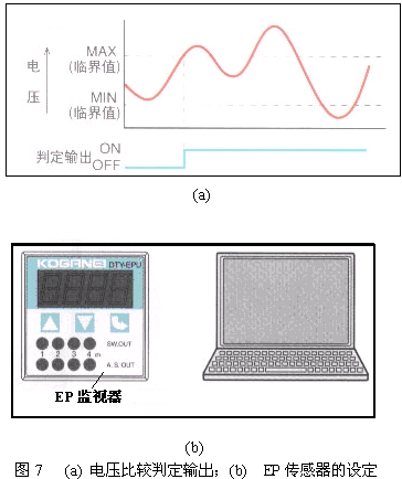 ⑷ 判定输出功能。一旦超过设定电压(临界值),便会通过传感器LED和电压比较输出(判定输出)发出通知,如图7(a)所示。