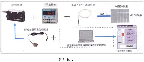 从图8可知,通过电脑进行设定的EP监视器连接是由外部控制装置与电脑及其组件构成。而组件必需是EP传感器1台(如DTY-EPS型)与EP监视器1台(如DTY-EPU)及电源SW•通信电缆线.及EP传感器用通信电缆线。