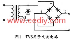 图1所示是一个双向TVS在交流电路中的应用电路。应用TVS可以有效地抑制电网带来的过载脉冲,从而起到?;ふ髑偶案涸刂兴性骷淖饔谩M?中的TVS箝位电压应不大于电路的最大允许电压。