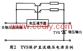 图2是一个直流稳压电源,在其稳压输出端加上TVS,可以?;な褂酶玫缭吹囊瞧魃璞?,同时还可以吸收电路中晶体管的集电极到发射极间的峰值电压,从而?;ぞ骞?。建议在每个稳压源的输出端增加一个TVS管,这样可以大幅度地提高整机的可靠性。