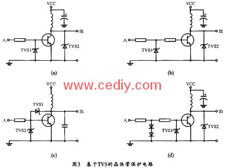 各种瞬变电压能使晶体管的EB结或CE结击穿而损坏,特别是晶体管集电极有感性(线圈、变压器、电动机)负载时,通常会产生高压反电势,因而可能使晶体管损坏。在实际应用中,建议采用TVS作为?;て骷?。图3所示为TVS?;ぞ骞艿乃闹值缏肥道?。