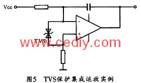 集成运放对外界电应力非常敏感。因此,在使用运放的过程中,如果因操作失误或采取了不正常的工作条件,往往会出现过大的电压或电流,特别是浪涌和静电脉冲,从而很容易使运放受损或失效。图5所示是用TVS在运放差模输入端防止过压损伤的?;さ缏?。