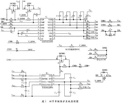 该保护系统采用精工电子三/四节串联锂离子可充电电池专用充、放电?;CS-8254构建一级保护。S-8254系列内置高精度电压检测电路和延迟电路,针对各节电池进行高精度电压检测,实现单节过充电?;ず偷ソ诠诺绫;?,并具备三段过电流检测功能,通过外接电容可设置过充电检测延迟时间、过放电检测延迟时间和过电流检测延迟时间1(过电流检测延迟时间2和过电流检测延迟时间3在芯片内部被固定)。该系统采用精工电子S-8244系列内置高精度电压检测电路和延迟电路的锂离子可充电电池二级?;ぷㄓ肐C实现电池的单节二级充电?;?,其保护延迟时间可通过外接电容的容值来设置。