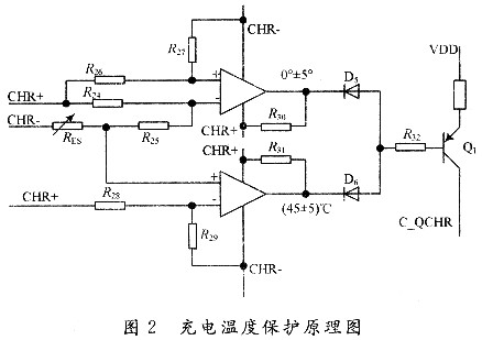 若误将充电器的正、负极反接入系统中,则会由充电器和电池共同形成一个大电流回路,导致元器件损坏,甚至带来更大的安全危害。该系统在充电回路中串接进一个防反接二极管D1,这样即使充电器反接,因此时CHRl的电位将高于CHR+,由于二极管D1的存在,系统将构不成回路,从而对其起到了?;ぷ饔?。