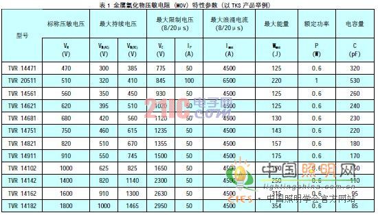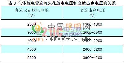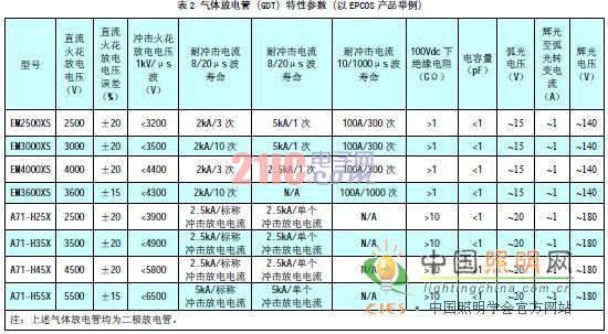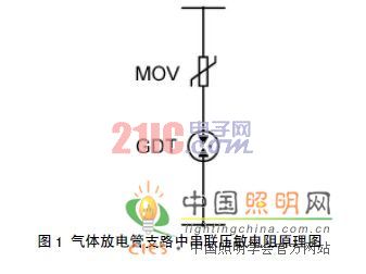 为了使LED路灯能够满足安全要求,气体放电管的耐压选择至关重要,应该选取足够耐压的气体放电管与压敏电阻配套,压敏电阻和气体放电管串联电路(如图1)应能够承受基本绝缘的耐压。几种气体放电管的直流火花放电电压和交流击穿电压的关系见表3,气体放电管的直流火花放电电压一般应选不低于2500V。