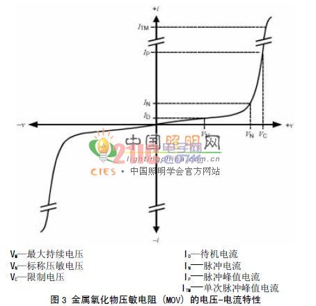 金属氧化物压敏电阻(MOV)的电压-电流特性见图3,金属氧化物压敏电阻(MOV)特性参数见表1。气体放电管(GDT)的电压-电流特性见图4,气体放电管(GDT)特性参数见表2。