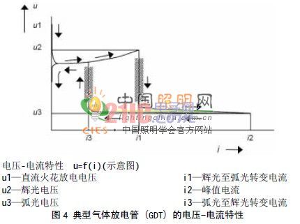 由于浪涌干扰所致,一旦加在气体放电管两端的电压超过火花放电电压(图4的u1)时,放电管内部气体被电离,放电管开始放电。放电管端的压降迅速下降至辉光放电电压(图4的u2)(u2在表2中的数值为140V或180V,与管子本身的特性有关),管内电流开始升高。随着放电电流的进一步增大,放电管便进入弧光放电状态。在这种状态下,管子两端电压(弧光电压)跌得很低(图4的u3)(u3在表2中数值为15V或20V,与管子本身的特性有关),且弧光电压在相当宽的电流变动范围(从图4的i1→i2过程中)内保持稳定。因此,外界的高电压浪涌干扰,由于气体放电管的放电作用,被化解成了低电压和大电流的受?;で榭觯╱3和i2),且这个电流(从图4的i2→i3)经由气体放电管本身流回到干扰源里,免除了干扰对灯具可能带来的危害。随着浪涌过电压的消退,流过气体放电管的电流降到维持弧光放电状态所需的最小值以下(约为10mA~100mA,与管子本身的特性关),弧光放电便停止,并再次通过辉光放电状态后,结束整个放电状态(熄弧)。