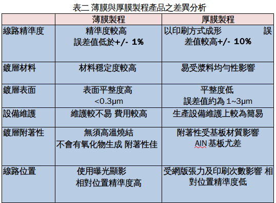 但从产品成本结构来看,如表二所示薄膜产品的工艺设备(黄光微影)与生产环境(无尘或洁净室)相较于厚膜产品其成本较高,然而薄膜工艺的金属线路多以厚铜材料为主,相较于厚膜印刷之厚银而言,材料成本却相对较低,因此,可预期的当利用薄膜工艺将陶瓷基板金属化的产品,日渐达到经济规模时,其成本将逐渐趋近于厚膜产品。