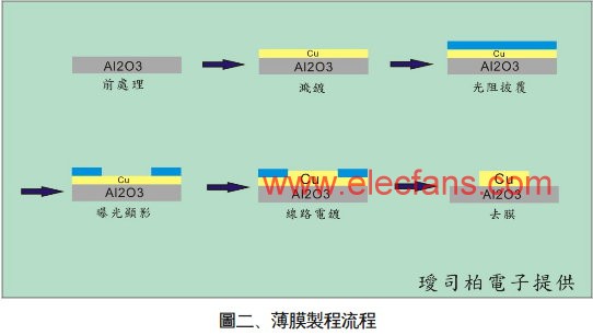 薄膜技术的导入正可解决上述线路尺寸缩小的工艺瓶颈,结合高真空镀膜技术与黄光微影技术,能将线路图形尺寸大幅缩小,并且可同时符合精准的线路对位要求,其各单元的图形尺寸的低差异性(高均匀性)更是传统网版印刷所不易达到的结果。在高热导的要求下,目前璦司柏(ICP)的薄膜工艺技术已能克服现阶段厚膜工艺在对位精准度的瓶颈,图(二)即为薄膜工艺之简易流程图,在空白陶瓷基板上(氧化铝/氮化铝)经过前处理之后,镀上种子层(sputtering),经过光阻披覆、曝光显影,再将所需之线路增厚(电镀/化学镀),最后经过去膜、蚀刻步骤使线路成形,此工艺所备制之产品具有较高的线路精确度与较佳的金属镀层表面平整度。