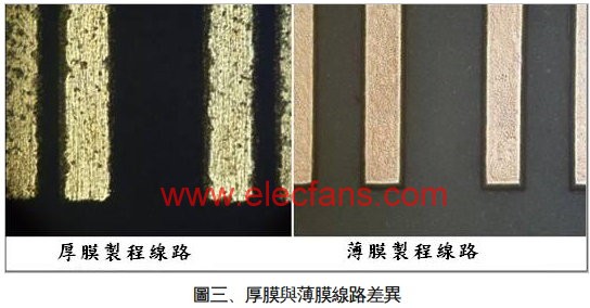 图(三)即为璦司柏薄膜基板产品与传统厚膜产品的金属线路光学显微图像??擅飨钥闯龊衲び∷⒅呗罚浔砻婢哂忻飨缘目佣辞蚁咛醯钠秸炔患?,反观以薄膜工艺制备之金属线路,不但色泽清晰且线条笔直平整。