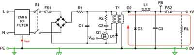 本地电路直流接地与电源接地参考电压间的链路通常由负责将线路电压转换成所需直流输出的电源提供。图1显示了一款低成本开关模式电源的简化结构图,该开关模式电源通常用于个人电脑、激光打印机和其他设备。SMPS输出的直流接地通过SMPSChassis以电源的?;ば越拥?PE)导线为参考。因此,该直接链路起了一个感应导线的作用,从而将PE电压变成了本地直流接地电压。