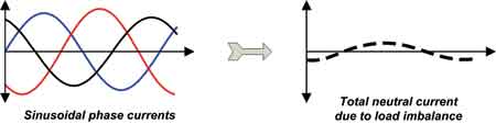 所有中性导线都并入配电板中的一个大直径中性导线,就像一个变压器一样(见图5)。在线性负载情况下,多相位系统的中性电流在一定程度上相互抵消。由于负载不平衡(见图3),只有总中性电流的一小部分保留了下来。