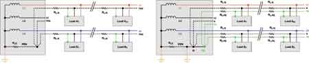 大多数电气安装均采用TN-C或TN-C-S接地系统,图5显示了这两种接地系统。“TN”是指中性线路在变压器处实现了接地(Frenchterre)。字母“C”表示通过一个导线而实现的PE和中性线路的组合使用,标记为“PEN”。PEN贯穿整个系统,直到一个分布点(即一个安装板)接近负载为止,其在此处被拆分为PE和直接连接到负载的独立中性导线。