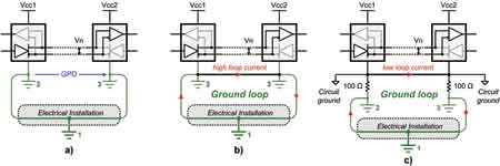 就仅限于一个本地电源供电的电路而言,GPD不会导致什么问题。在设计两个远程电路间的通信链路时(即现场总线-收发器站),GPD就变得引人关注了,这两个远程电路间的通信链路由不同的电源供电。