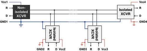 图8显示了两个远程收发器节点的详细连接,而图9则显示了一个使用了多个收发器的隔离式数据传输系统的例子。除1个收发器以外,所有其他的收发器均通过隔离连接至总线。左侧的非隔离收发器为整个总线提供了单接地参考。
