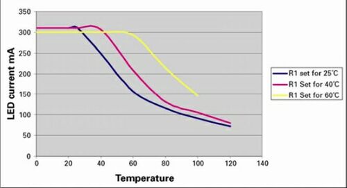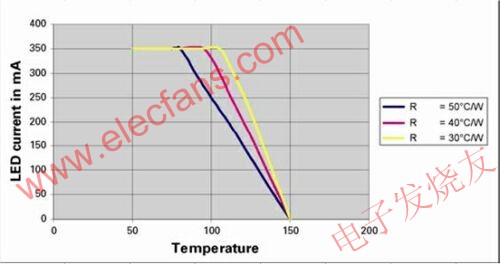 图1中曲线显示了1WLED的典型性能下降特性。正如所期望的那样,这清楚地表明,被恒定电流驱动的LED在到达某一点后,该恒流需要线性地减少,直到在150℃这一点上达到0。恒流下降点和减小斜率取决于机械/散热安排。