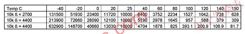 表1:该表显示了一个典型的10kΩ标称热敏电阻在3个不同β值时的电阻值。