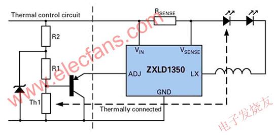 图3显示了一个典型的采用简单热控制的降压稳压器例子。它的优势是利用了Zetex半导体公司ZXLD1350的ADJ引脚。通过使用一个PNP晶体管作为发射极跟随器和使用该引脚的内部250kΩ电阻作为负载来过驱该引脚,LED电流将与热敏电阻成比例地下降。随着温度下降,热敏电阻的阻值增加,但由于基准(base)电压增加超出了ADJ参考电压,该晶体管就会关闭,LED仅获得其最高设置电流,从而有效地钳住低温响应。