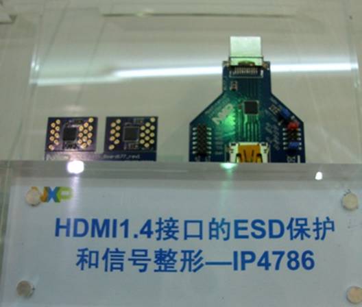 高先生首先介绍了恩智浦半导体用于HDMI1.4接口的ESD?;ず托藕耪蜪P4786,具有IEC61000-4-2ESD?;?,超低潜位电压,集成信号整形功能,如线缆延长,电平转换;采用了HVQFN32小型化封装(5mm*5mm);集成新的滤波技术,对高速信号保持低的差分阻抗。
