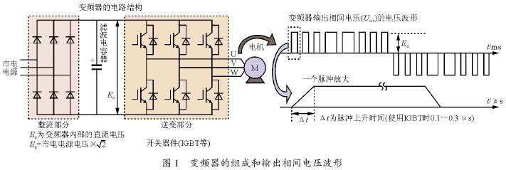 变频器主要由把交流市电整流成直流的整流器、平滑电压脉动的电容器、6 个开关器件构成的逆变器所组成。如图1 所示,逆变器部分输出由改变脉冲宽度(PWM 波)形成的等效正弦波交流电压去驱动电机。近几年的变频器为了使电机低噪音化,逆变部分的开关器件采用IGBT进行着高速开关动作。因此,在PWM 波的每个脉冲上升和下降时,即开关时间以非常短的时间驻t=0.1~0.3 滋s切换着的时候,使逆变器内部的直流电压Ed(400 V电力系统用逆变器的Ed=600 V左右)因切换所形成的电压变化率dv/dt变得很大,这是产生微浪涌的主要根源之一。