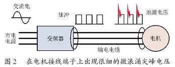 微浪涌电压是变频器和电机之间的接线长度很长时,在电机接线端产生的极细的尖峰浪涌电压。如图2所示,逆变器的输出电压是脉冲状,在电机接线端子上发现在脉冲状的波形上又叠加了微浪涌电压尖峰。一般情况下,微浪涌电压的尖峰值将会是逆变器内部的直流电压的2 倍。