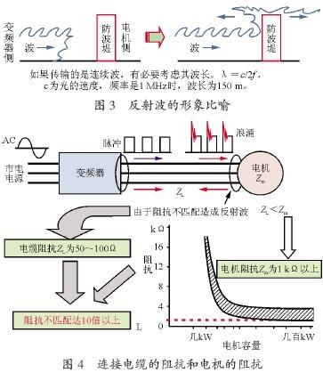 变频器的输出脉冲上升或下降时间很短,是叠加在变频器输出给电机的驱动频率(基波)及脉冲调制频率(调制波)之外的高频成分。一般情况下,变频器与电机连接电缆的阻抗ZL是50~100 赘,而电机本身的阻抗ZM,一般数百kW的电机也都超过1 k赘,是电缆阻抗的10 倍以上。这样,在电机的接线端子上将发生阻抗的不匹配现象,造成高频波成分的反射。在不匹配阻抗连接处的反射系数M为