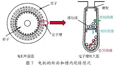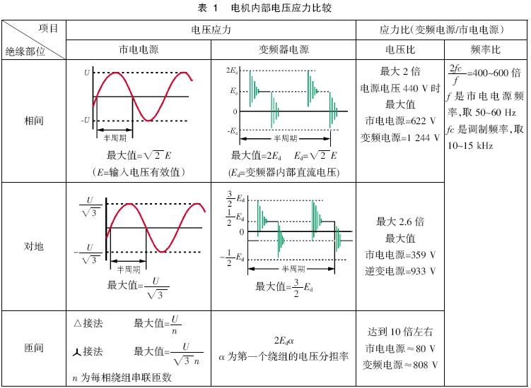 电机内部的断面如图7 所示。电机有定子和转子,定子内有安放三相线圈的槽。如果放大槽的内部,可以看到有许多的线圈(漆包线),各线圈对地之间、各相之间、线匝相互之间都有绝缘存在。通常对地、相间都有绝缘纸插入,而线匝之间没有绝缘纸插入,它利用坚固的漆包线的漆层获得绝缘。微浪涌电压给这些绝缘全部带来影响,这些绝缘损坏之中,线圈匝间损坏最多。表1 列出了有关电机内部各绝缘部分承受的电压值,也称为电压应力,提供了用市电电源驱动电机和用变频器驱动时相比较的资料。