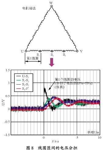 浪涌电压渗入电机内部的时候,线圈匝间究竟加上多少电压,模拟结果如图8所示。该模拟是将测量点放在电机的每一线圈上(电机槽内的漆包线圈上),在U-V之间加上上升时间0.14 滋s 的浪涌电压的测量的结果。U-S1之间是第1 线圈分担的电压,测得它分担了全电压65豫耀75%,而别的线圈S1-S2、S2-S3、S3-V 之间分担了10豫耀20%,这是因为电机内部的阻抗大,微浪涌电压在逐渐衰减。