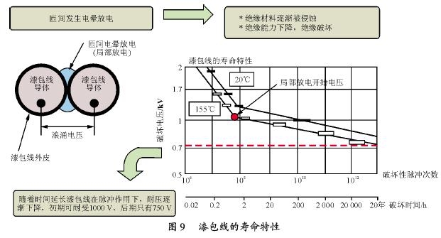 在电机的制造过程中,漆包线线圈的起头到末尾完全分离不易做到,多数情况下是乱绕的,槽里边线头和线尾可能紧挨着。如果这样就会发生线匝之间由于微浪涌电压的电晕放电(局部放电)。那怕放电部分时间极其短促,局部也会达到10 000益,高温使绝缘逐渐地侵蚀,过些时间之后绝缘就会被破坏。如图9 所示为直径0.85 mm、漆皮厚33 滋m、F 级绝缘、155益漆包线的寿命特性。