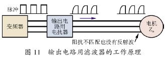 输出滤波器的工作原理如图11所示。微浪涌电压是变频器输出脉冲上升时间出现的dv/dt 过大所引起,又由于阻抗不匹配被反射而发生。因此输出电路使用滤波器,用于抑制dv/dt,也就是抑制了高频成分因阻抗不匹配而造成的微浪涌。所以输出滤波器是dv/dt抑制型滤器,这种滤波器在变频器的调制频率为15 kHz、接线长度为400 m时,能做出微浪涌电压1 000 V以下的性能非常优良的产品。不过,这种方式的滤波器为了让逆变器的输出电流通过电抗器,不得不做成大容量,造成滤波器的大型化、高价格化、大重量,有的达到50 kg以上,给用户造成了实际负担。