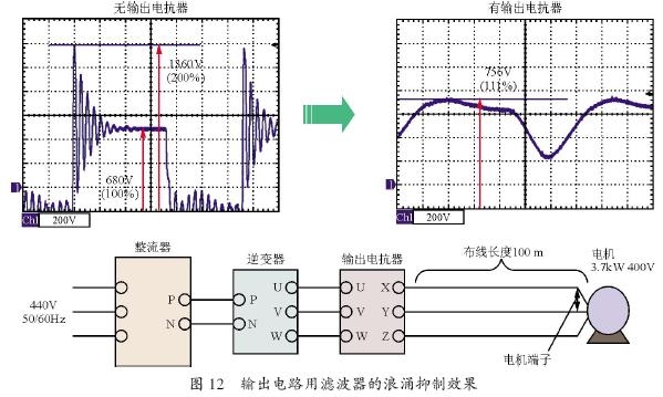 图12 显示了供电电源440 V,功率为3.7 kW的变频器供电给电机(3.7 kW,400 V),在接线长度为100 m时、测量电机接线端子U-V 之间的微浪涌电压的抑制效果。在没有输出滤波器的情况下,微浪涌电压达到1 360 V,相当于变频器内部直流电压680V 的200%。有输出滤波器的时候,顶峰值电压是756 V、相当于变频器器内部的直流电压680 V的111%,它和没有输出滤波器的顶峰电压差距有604 V,抑制效果达89%。