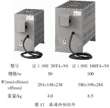 图13 所示为浪涌抑制组件的外观。和输出滤波器相比,浪涌抑制组件是小型化的产品。其技术指标为相间的微浪涌电压1 000 V以下,防护等级为IP20。浪涌抑制组件是对变频器的容量不需要选择,而接线距离需要选择的产品。另外,接线方法非常简单,只需要把浪涌抑制组件的输入电缆接到电机接线端子U、V、W上。