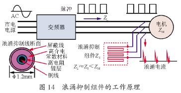 浪涌抑制组件的工作原理如图14 所示。浪涌抑制组件内部卷绕的浪涌抑制线具有和电缆线的阻抗ZL相同的阻抗,因此接到电机的接线端子上降低了电机接线端子的阻抗,从而减少了阻抗不匹配时的反射波。通常高频波成分在电缆线上的阻抗ZL是50耀100 赘,设计的浪涌抑制线的阻抗ZS是50~60欧。