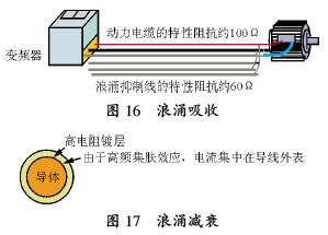 浪涌吸收:浪涌是高频波成分,低阻抗的浪涌抑制线接在电机接线端子上,让浪涌电流流到抑制线里面去,如图16所示。