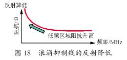 浪涌抑制线的反射降低:浪涌电流的高频分量在浪涌抑制线内被旁路和衰减,使浪涌形状变钝,浪涌频带中心向低频方向移动。又从浪涌电流来看,好像浪涌抑制线的特性阻抗逐渐变高了,使得抑制线末端不易被反射回来。如图18所示。