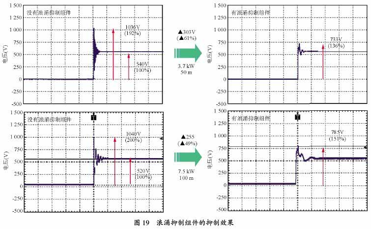 图19 是变频器的电源电压为400 V,3.7 kW的电机、接线长度50 m,和75 kW的电机、接线长度100 m时抑制微浪涌电压的效果。对于3.7 kW的电机,当没有浪涌抑制组件时,微浪涌电压为1 036 V,相当于变频器内部的直流电压540 V的192%;当加了浪涌抑制组件时,50 m电缆的峰值电压为733 V,相当于变频器内部的直流电压540 V的136%。电压尖峰差距303 V,有61%的抑制效果。对于75 kW的电机,当没有浪涌抑制组件时,微浪涌电压为1 040 V,相当于变频器内部直流电压520 V的200%;当加了浪涌抑制组件时,电缆的峰值电压为785 V,相当于变频器内部直流电压520 V得151%。电压尖峰差距255 V,有49%的抑制效果。