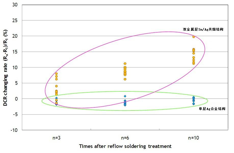 单层Ag合金结构的保险丝即使经过多次高温热处理,其冷阻抗变化很小。但是双层Sn/Ag共熔结构的保险丝,其冷阻抗有明显变高的趋势(约升高10~20%),且变异也较大。