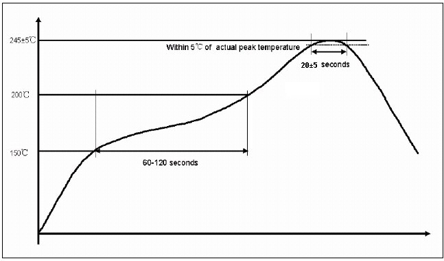 2.回流焊锡炉内温度条件(图2),最高温245±5?C/20±5秒,作业时间240±10秒。