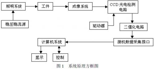 整个检测系统由照明系统、被测工件系统、成像物镜、CCD 光电检测系统和计算机测控系统(8031 单片机和8279 键盘/显示芯片等)构成。稳压稳流调光电源为远心照明系统提供稳定的照明光,被照明的工件经成像物镜成像在线阵CCD 的光敏阵列面上。由于工件不透光,工件的像在中间部分形成暗带,两侧形成亮带。 暗带的宽度就是工件尺寸所成像的大小。线阵CCD 在驱动脉冲的作用下完成光电转换并产生视频信号。其系 统原理图如图1。
